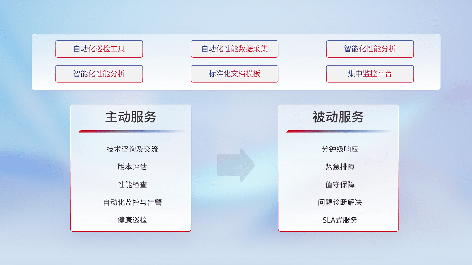智能化工具和标准化文档,,,保障服务质量,,,,提供主动服务(包含技术咨询、、、、版本评估、、性能检查、、自动化监控与告警、、、健康巡检)和被动服务包含(分钟级响应、、、、紧急排障、、值守保障、、问题诊断解决、、、、SLA服务)。。。。